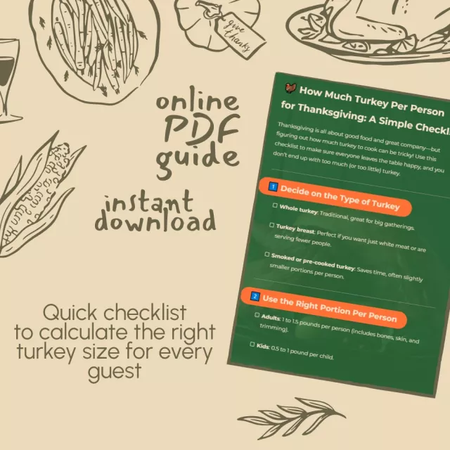 This isn’t just another holiday planning resource—it’s a straightforward, practical guide designed specifically to answer the most common Thanksgiving hosting question: how much turkey per person for Thanksgiving. Instead of sorting through complicated articles, you’ll have a clean, organized checklist at your fingertips to help you plan like a pro. It’s perfect for first-time hosts, seasoned holiday cooks, or anyone who wants a no-fuss way to simplify their Thanksgiving dinner prep.