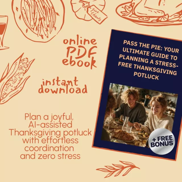 Transform your Thanksgiving chaos into calm with Pass the Pie: Your Ultimate Guide to Planning a Stress-Free Thanksgiving Potluck. This beautifully designed digital eBook is your go-to companion for hosting a joyful, organized, and delicious potluck celebration. Whether you’re coordinating a family feast, a Friendsgiving, or a neighborhood gathering, this guide shows you how to plan a Thanksgiving potluck with ease, creativity, and modern tools — including smart AI tips to save time and reduce stress.